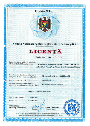 „Cis Gaz Trading” SRL este întreprindere pe piața liberalizată a energiei electrice din Republica Moldova, care oferă servicii conform licenței seria AC 001536 din 21.04.2021 , eliberată de către Agenția Națională pentru Reglementare în Energetică.